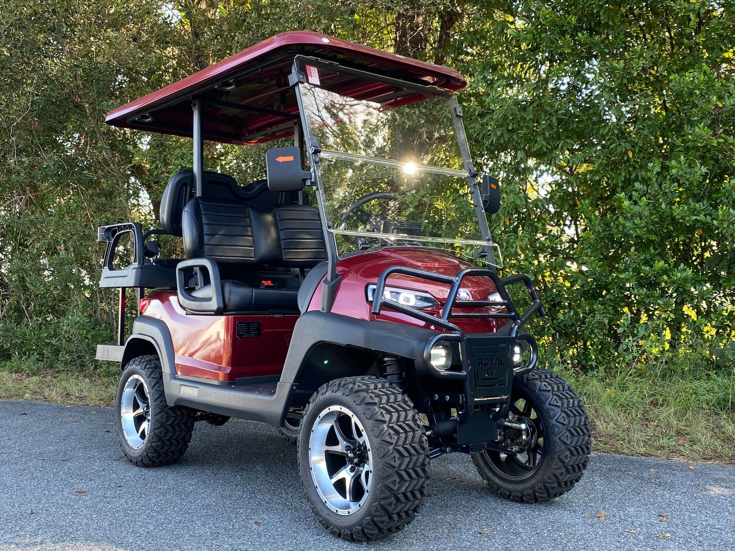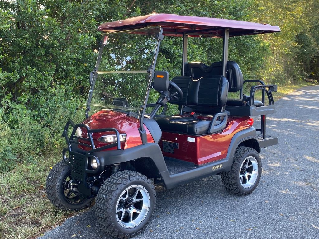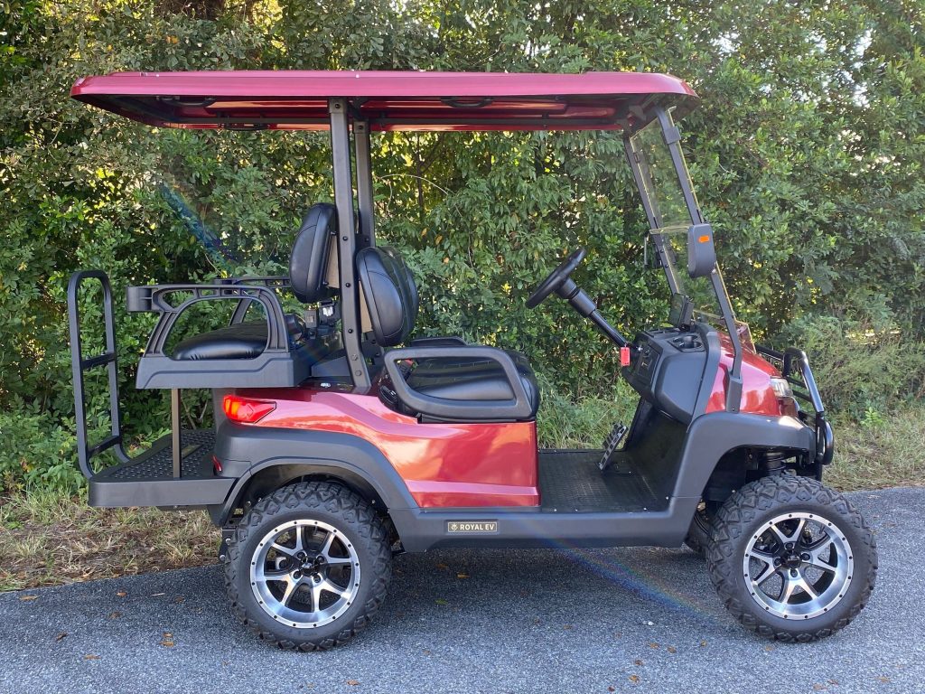 Royal EV Lithium C4L-L Golf Cart. The Royal EV Crown 4-Passenger strikes the ideal combination between performance, luxury, and street-legal capability. This model is built in Calhoun, Georgia with American craftsmanship and boasts a powerful 72V lithium battery system that provides great range and performance. Royal EV 4-Seater Golf Cart